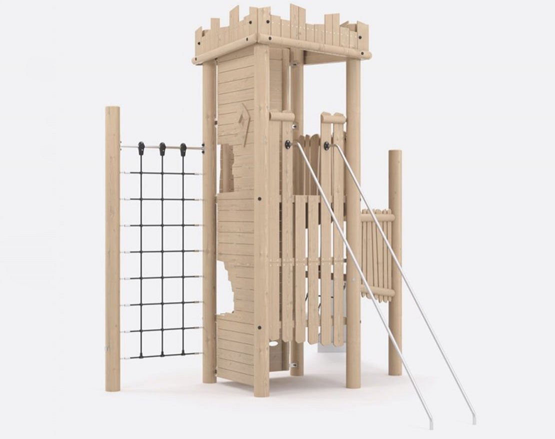 Состоит из опорных стоек, металлических труб-лазалок, канатной сетки и металлической открытой горки с защитными бортиками. Одна стена крепости спроектирована под скалолазную панель — в ней продуманы отверстия для рук и ног. Для большей безопасности и комфорта, конструкция оснащена ручками-стропами.