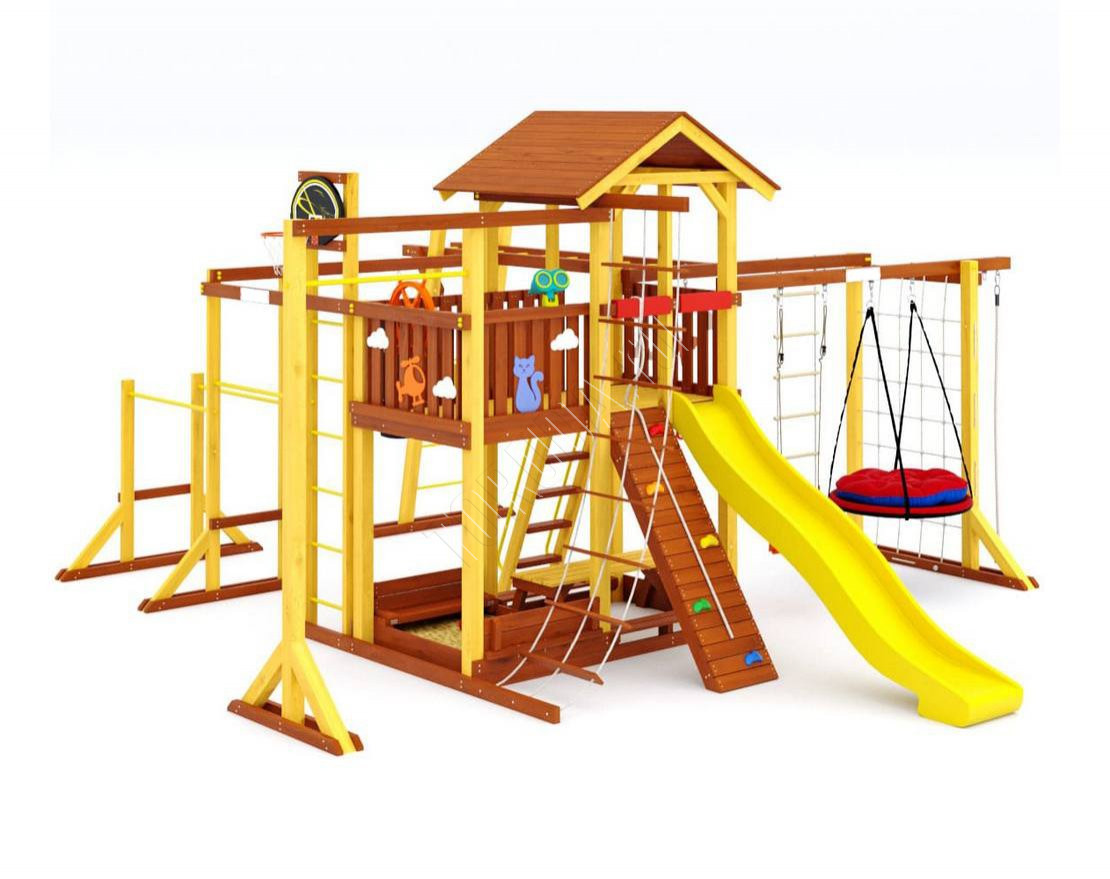 - Многообразие игровых элементов: в комплектацию входят скалодром, сетка-лазалка, турники, гимнастические кольца, песочница с крышкой, которая трансформируется в две лавочки, и многое другое.